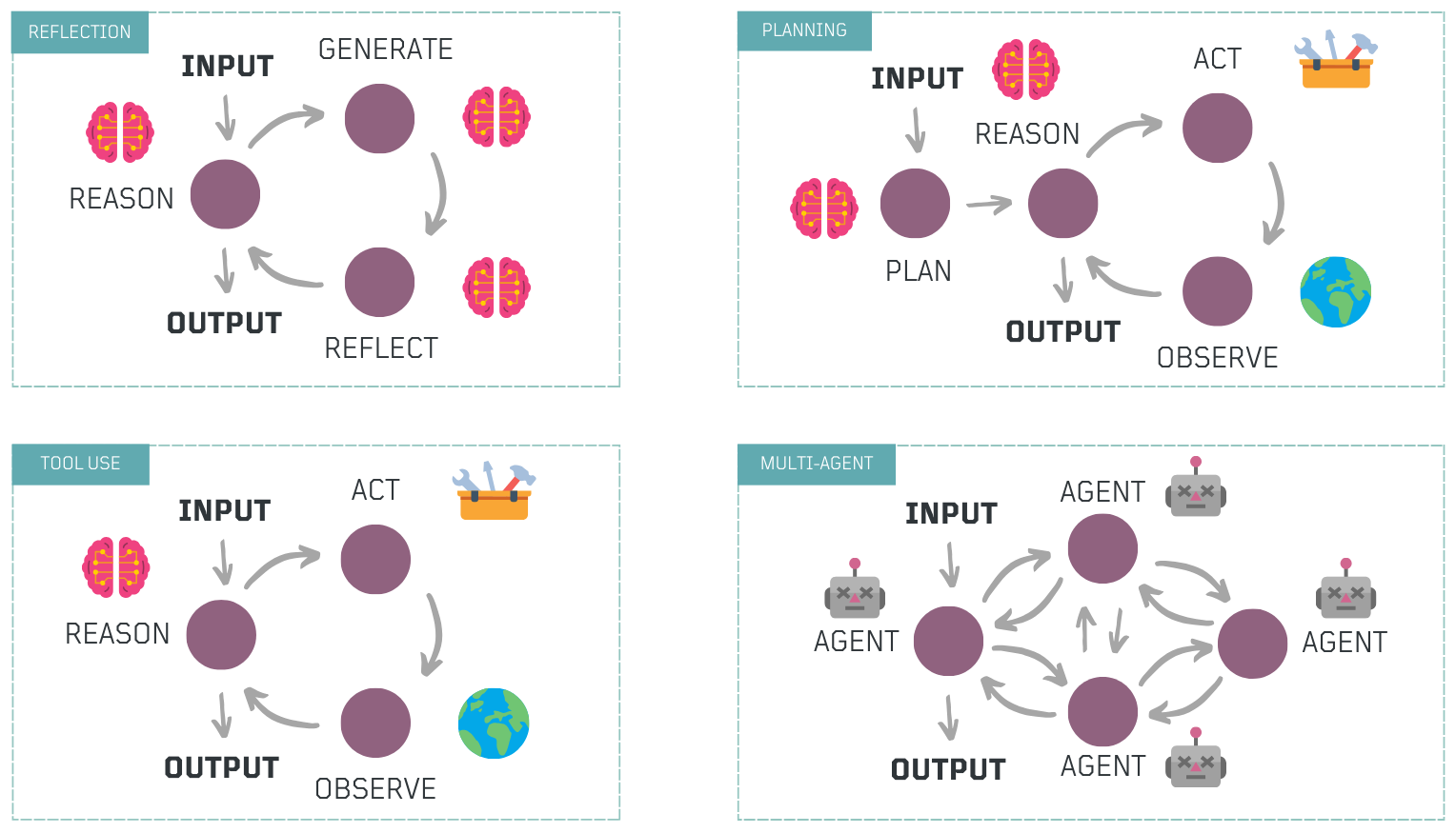Each of these patterns can function independently or be combined as modular components to build more advanced agentic workflows.