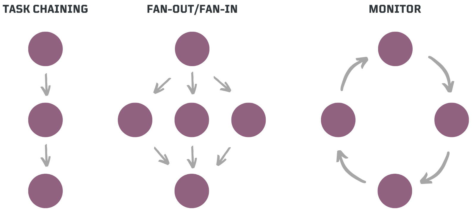 - Fan Out/Fan-In ⚡ → Parallel execution of multiple tasks followed by an aggregation phase, optimizing efficiency for large-scale processing.