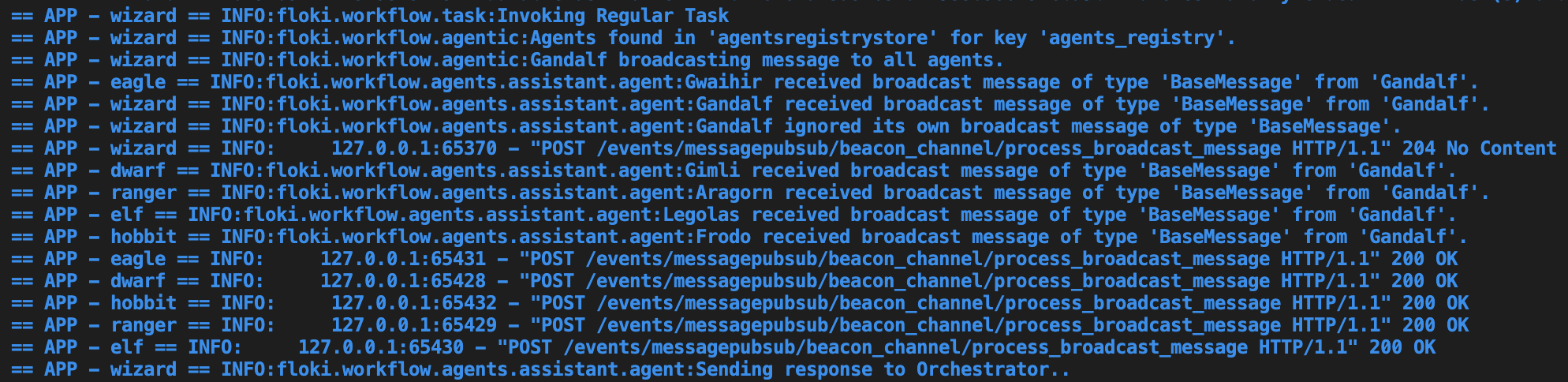 You are going to see agents invoking tasks, broadcasting messages to other agents an sending responses to the orchestrator.