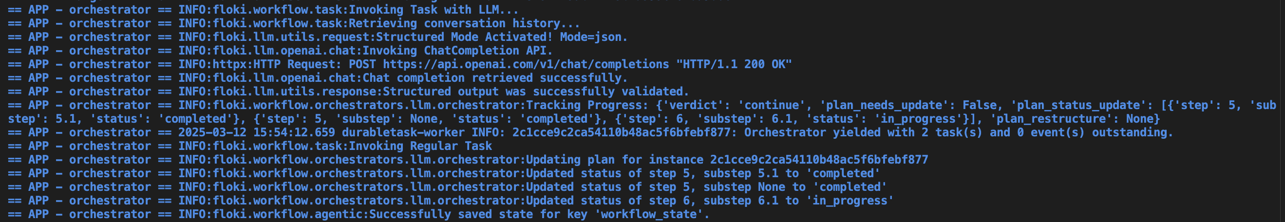 Finally, in Floki, the orchestrator saves its state to a local file, which can be found in the same directory where the orchestrator is defined. You can find an example here. It is fascinating to see it going through the whole plan, keeping chat history, updating the plan on each iteration if needed and capturing task completion.