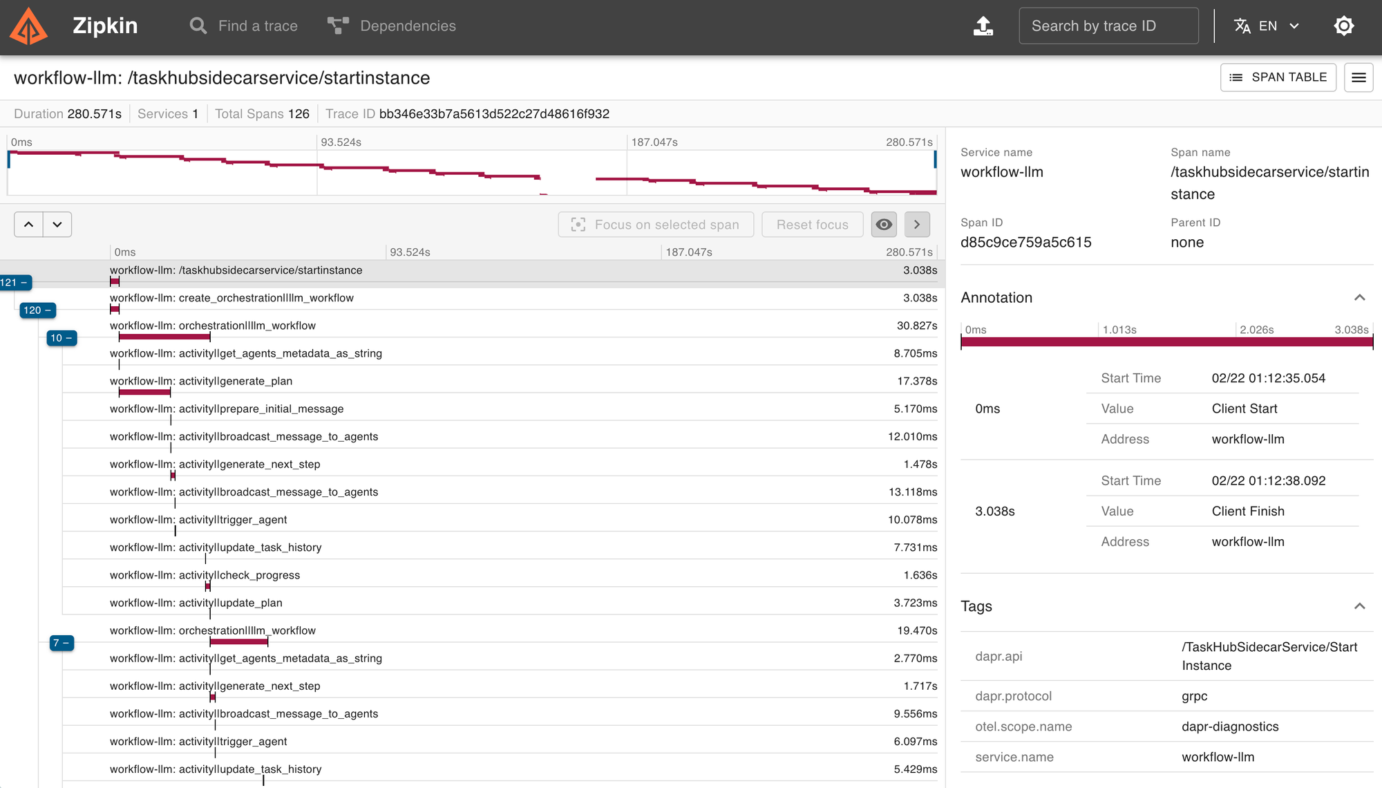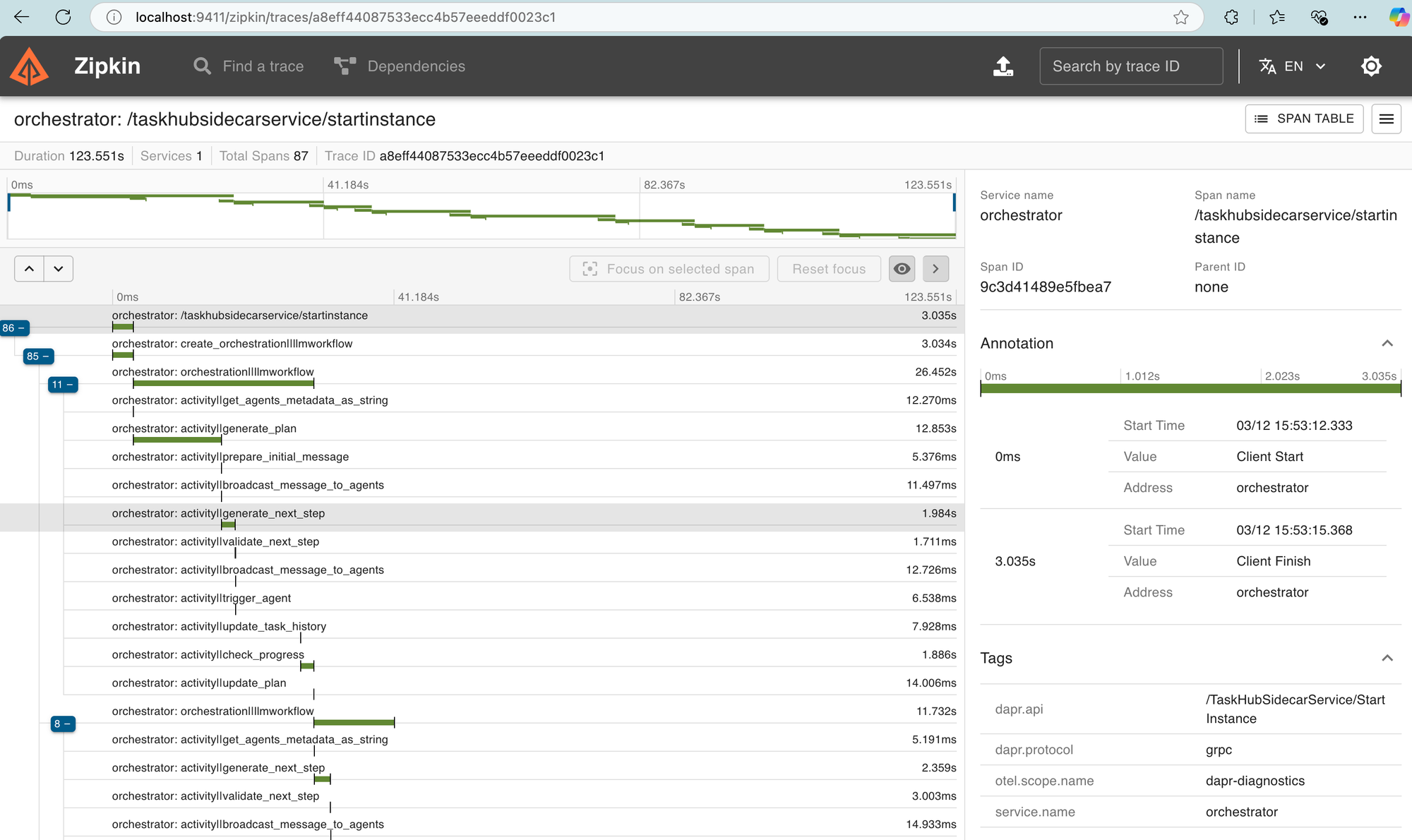 You can also go to http://localhost:9411/zipkin/ and check the telemetry collected by default over each tasks executed.