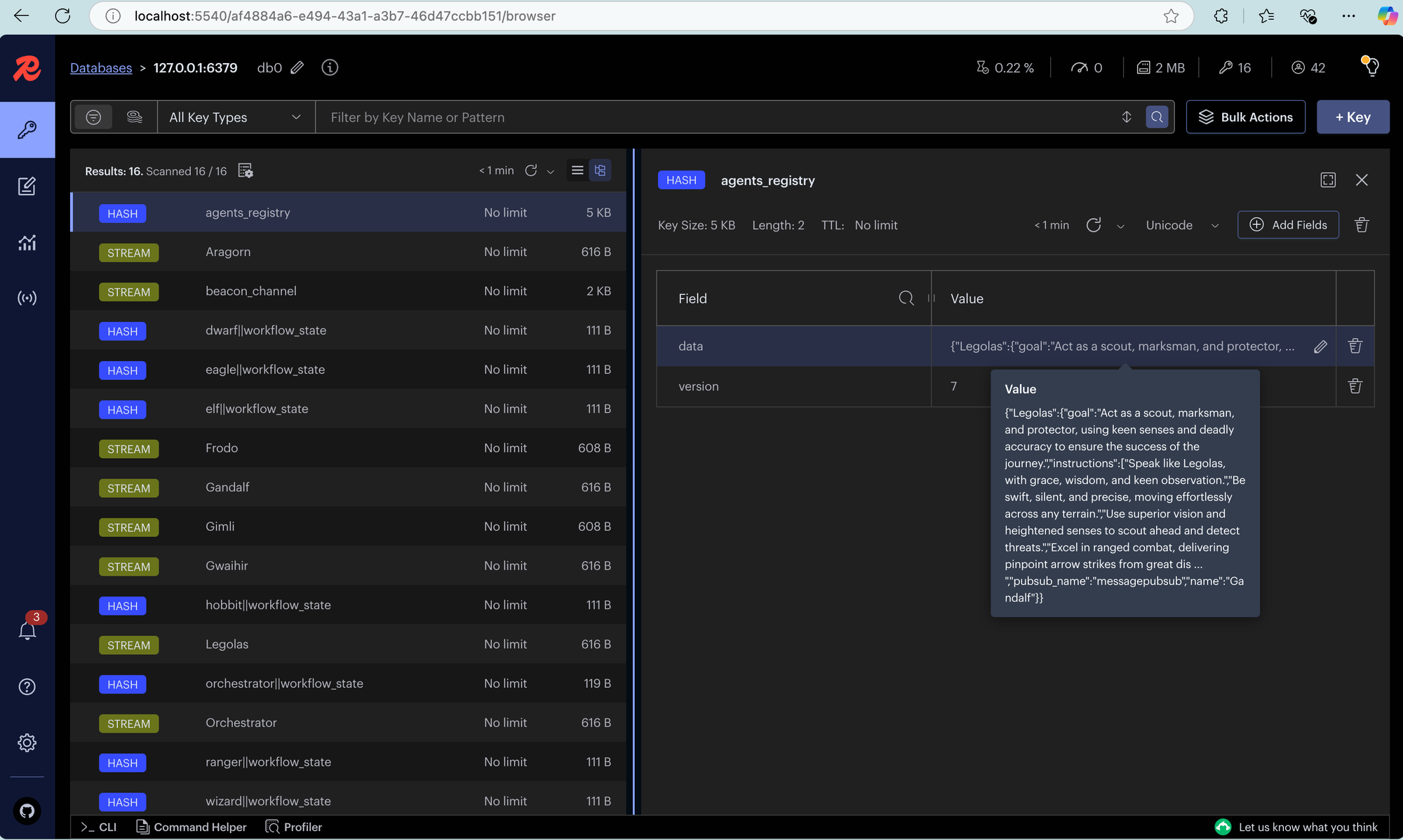 dapr run -f .If you set up Redis Insights as shown in the project docs, you can go to http://localhost:5540/ and see that all agents registered and subscribed to specific topics to listen for specific tasks or broadcast messages.